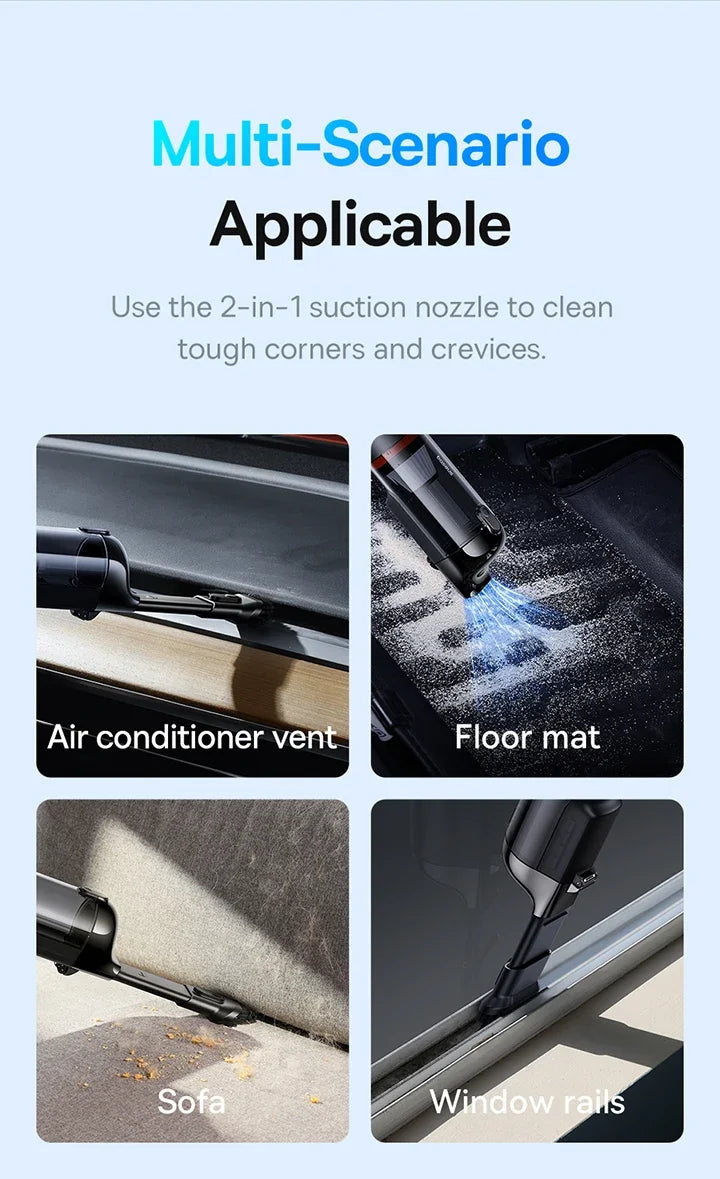- 2-in-1 Suction Nozzle: Crevice and bristle nozzles for versatile cleaning.
